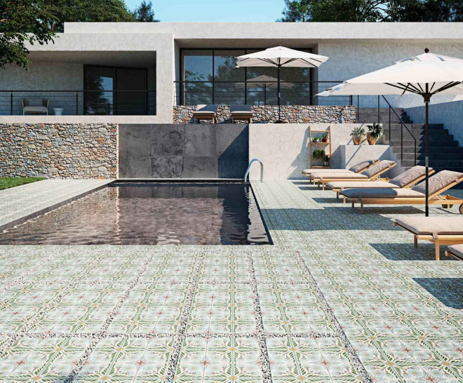La vida al aire libre es esencial en el estilo mediterráneo. Sus espacios exteriores, como terrazas y patios, se diseñan para fomentar la relajación y el disfrute del entorno. Muebles cómodos y acogedores, combinados con plantas exuberantes y detalles decorativos, crean un ambiente propicio para reuniones sociales, momentos de tranquilidad o simplemente para disfrutar del clima y la belleza del exterior. Gracias a los diseños y gráficas de los azulejos que tenemos a tu disposición en dysama, podemos incluso meter los detalles vegetales en espacios donde las plantas no son una opción.